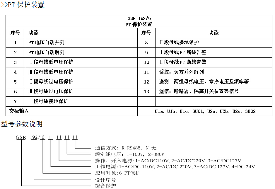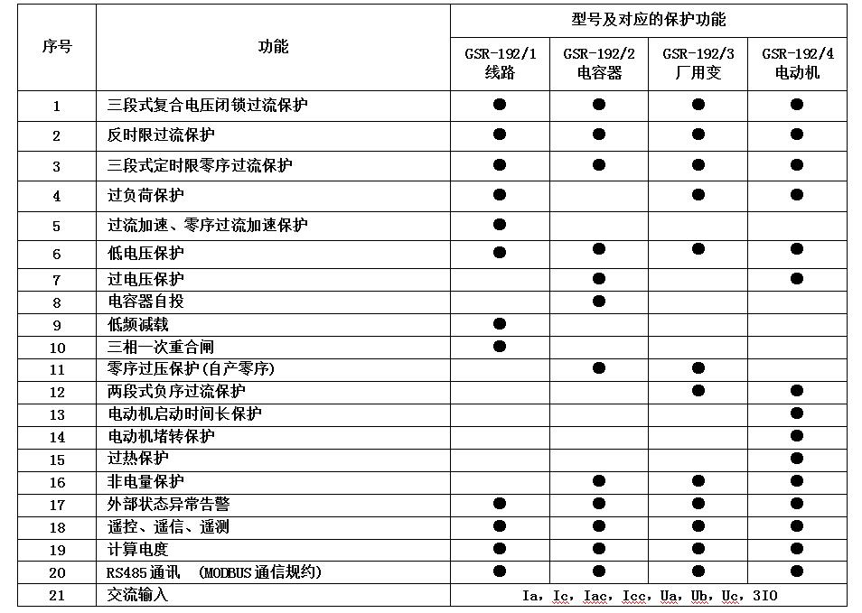 GSR-192系列綜合保護(hù)裝置(以下簡稱裝置)應(yīng)用于10kv及以下電網(wǎng)的線路、電容器、廠用變、電動機(jī)、電壓互感器設(shè)備的保護(hù)、控制及監(jiān)控。除以上保護(hù)裝置外還有備用電源自投控制裝置。所有裝置可組屏安裝,也可就地安裝在開關(guān)柜。